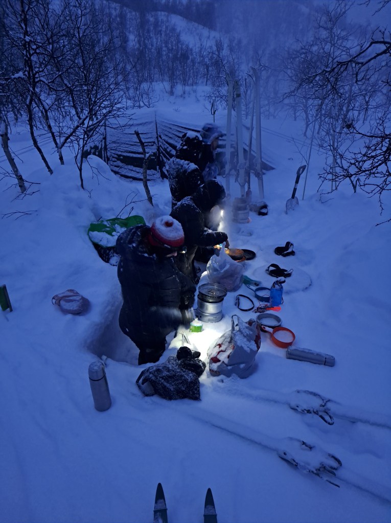 Toinen tärkeä oppi liittyi päivämatkoihin ja leiriytymiseen tarpeeksi ajoissa. Tuli huomattua aika äkkiä, että on todella tärkeää laittaa leiri pystyyn tarpeeksi ajoissa, koska askareet eivät pääty hiihdon tai teltan pystyttämisen jälkeen. Täytyy kiinnittää tulevalla reissulla erityisesti huomiota siihen, että energiaa on riittävästi jäljellä myös leiriaskareisiin ja ruoanlaittoon.