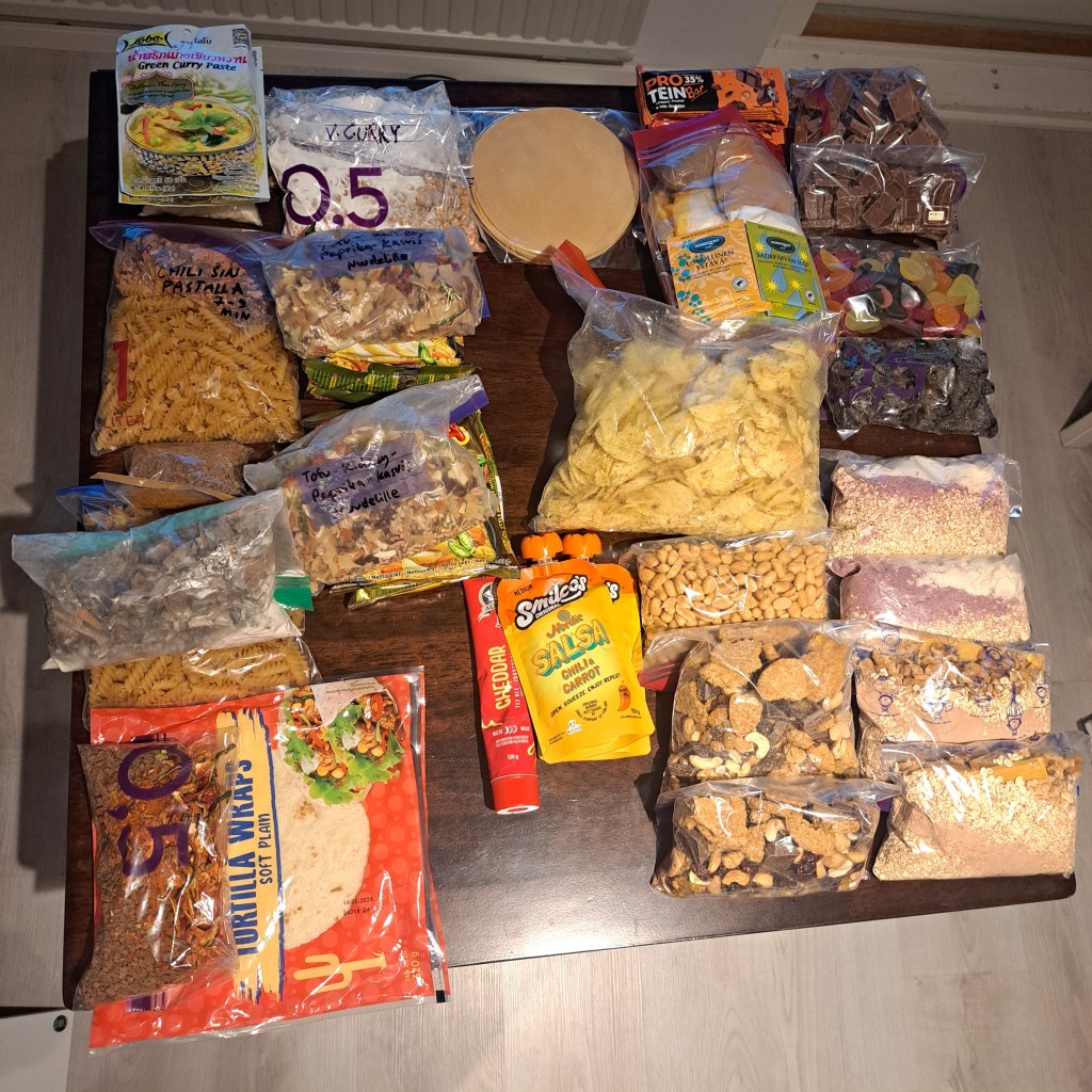 Ystäväni A:n kanssa olemme jälleen ruokapari, eli valmistamme päivälliset, lounaat ja aamupalat yhdessä. Lounaat laitetaan aamulla tekeytymään ruokatermariin, jotta lounastauolle ei tarvitse pysähtyä pitkäksi aikaa. Olemme jakaneet myös ruokien valmistelun puoliksi, eli minun kontolleni jää toteuttaa neljä aamupalaa ja kahdeksan ateriaa. Ateriat olen koonnut tänä vuonna aikaisemmin ylijääneistä kuivatuista aineksista, kuten tomaatista, kidneypavuista, tofusta, sienistä, kesäkurpitsasta ja paprikasta. Mukaan lähtee esimerkiksi vihreää currya, sienipastaa, chili sin carnea, nuudelia ja tortilloja. Aamupuuroihin olen laittanut muun muassa mustikkaa ja vaniljaheraa tai Biscoff-tahnaa ja pähkinöitä. Pakkaan lähempänä mukaan vielä valmiiksi täytetyt leivät, öljyä, juustoa ja pullaa.